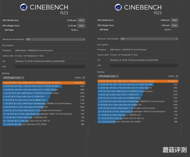 ▼跑个CineBench R23,单线程方面,9850X3D略强,多线程方面9800X3D略强,伯仲之间的感觉。另外就是,9850X3D貌似对PBO2的设置没反应,后续再研究看看。