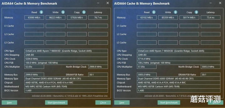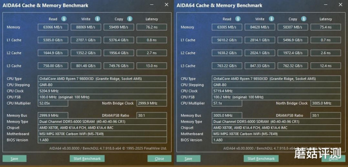 ▼跑个完整的测试,9850X3D得益于更高的频率,内存延迟、以及一级、二级、三级缓存延迟性能方面,都要略强一些。