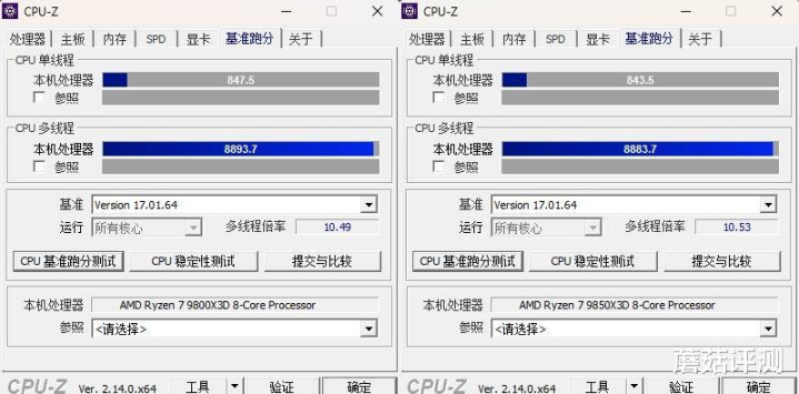 ▼简单跑个CPU-Z的性能测试,9800X3D在单核、多核性能方面略强。