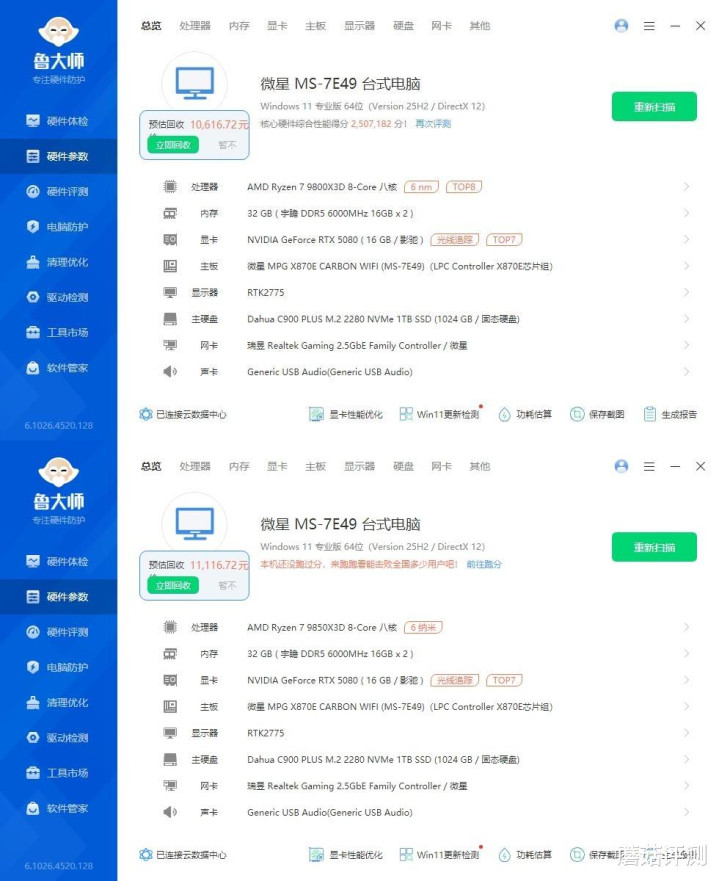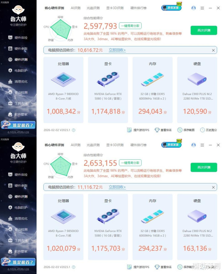▼简单跑个整机测试,9800X3D总分259.7W,9850X3D总分265.3W,其中处理器单独得分方面,9800X3D在100.8W,9850X3D在102W,分数9850X3D略高。