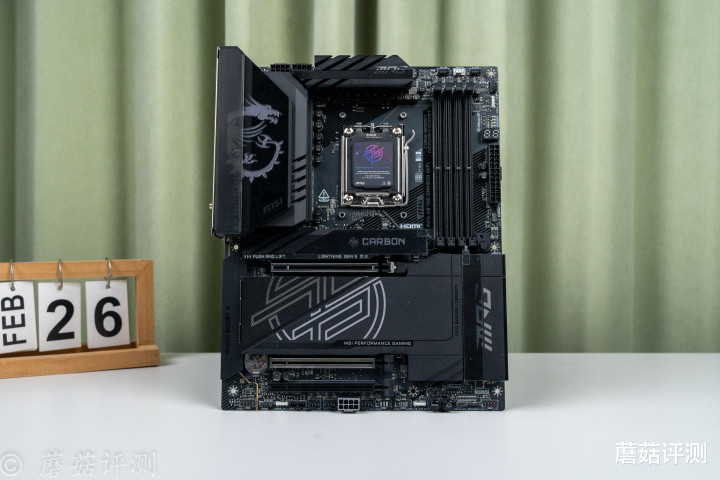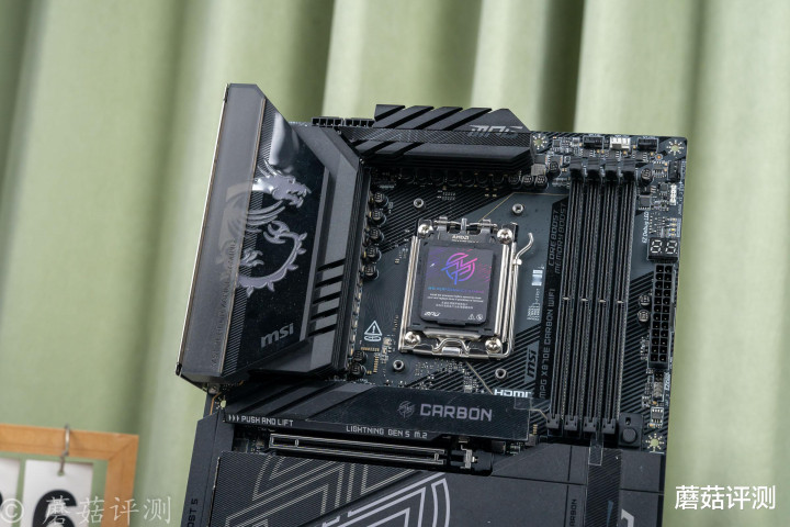 ▼微星这块MPG X870E CARBON WIFI暗黑主板,颜值方面非常漂亮,主板整体采用黑色配色,正面覆盖有大量的金属覆盖件,且金属覆盖件的表面均有漂亮的涂装和外观设计。