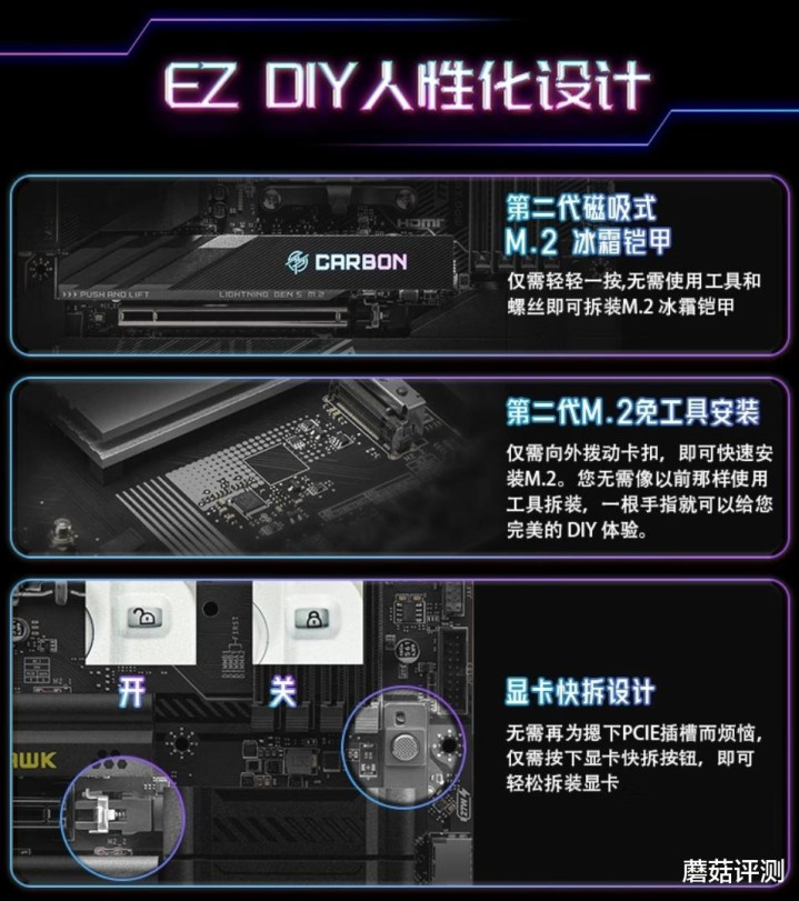 ▼另外这块主板还有很多EZ DIY人性化设计,M2固态硬盘的拆装、M2固态硬盘散热件的拆装,以及显卡的拆装,都特别的方便,无需工具,一键操作。