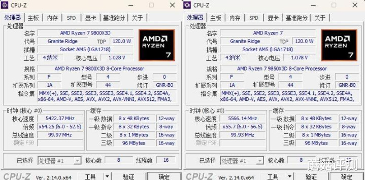 ▼打开CPU-Z,简单看下硬件参数,9850X3D在睿频方面要比9800X3D高0.4Ghz,其余方面没区别,步进也一样。