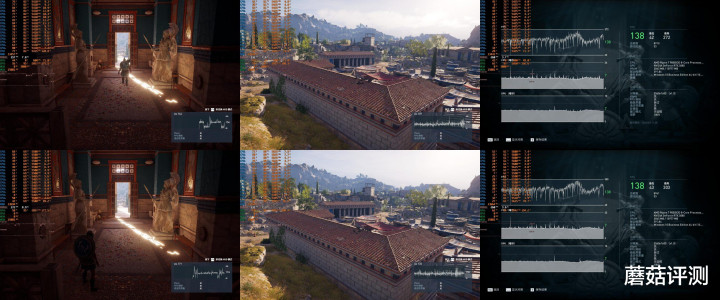 ▼终生平等奥德赛,2K分辨率,全极高画质,体积云最低,整体的平均游戏帧数完全相同,在138帧左右,但9850X3D的最低帧和最高帧都要明显高于9800X3D,在游戏中,处理器的频率略高、功耗略高、温度略高、占用略低。