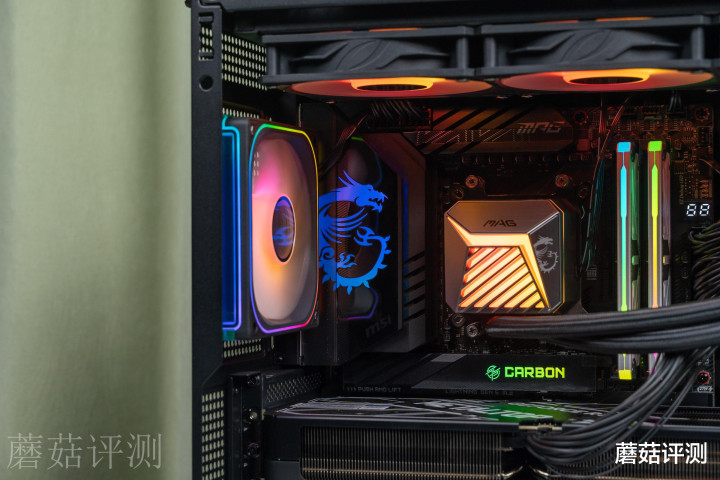 ▼微星MPG X870E CARBON WIFI暗黑主板的左侧供电覆盖件上还有漂亮的灯效设计,微星经典的龙标LOGO,搭配黑色的金属散热件,颜值很漂亮。