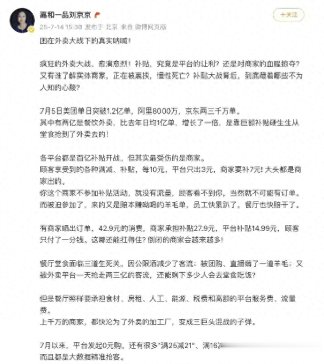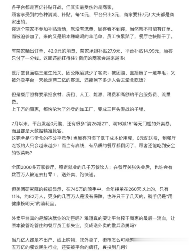 面对这场 “商家、消费者、骑手三输” 的困局,刘京京的四点呼吁戳中了行业痛点:停止裹挟商家补贴、限制低价倾销、降低平台佣金、保障骑手权益。